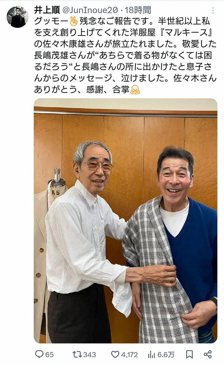長年の顧客だった井上も自身のXで「残念なご報告です。半世紀以上私を支え創り上げてくれた洋服屋『マルキース』の佐々木康雄さんが旅立たれました」と報告。