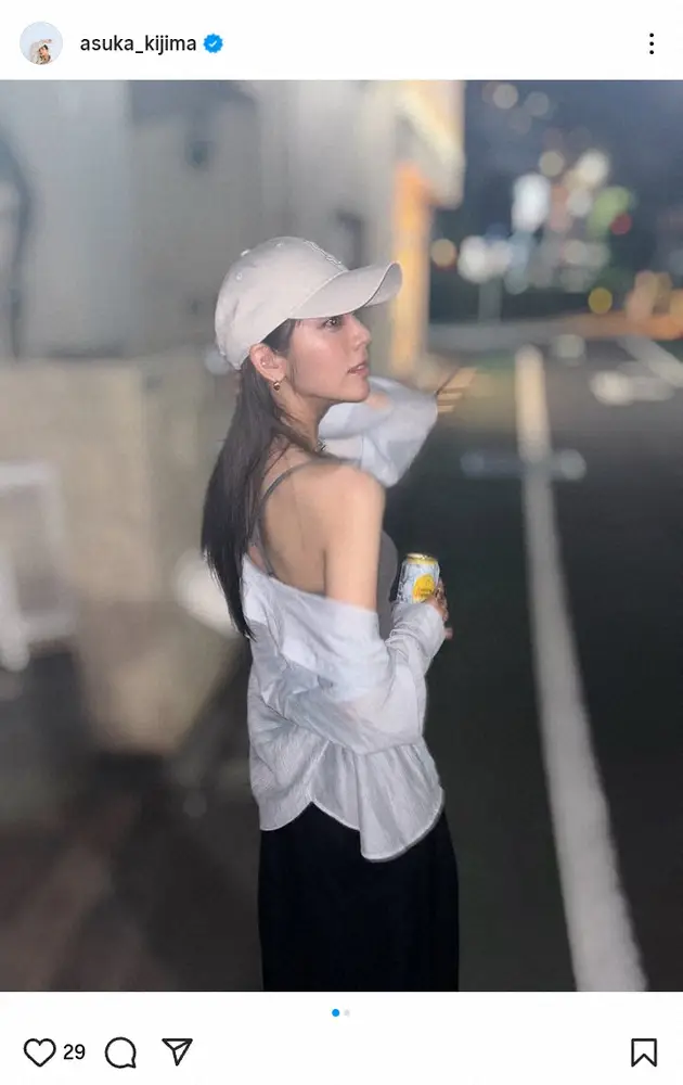 貴島は「よるさんぽ」とのみコメント。キャップを被り、ハイボールとみられる飲料缶を手にした街角での写真を披露した。