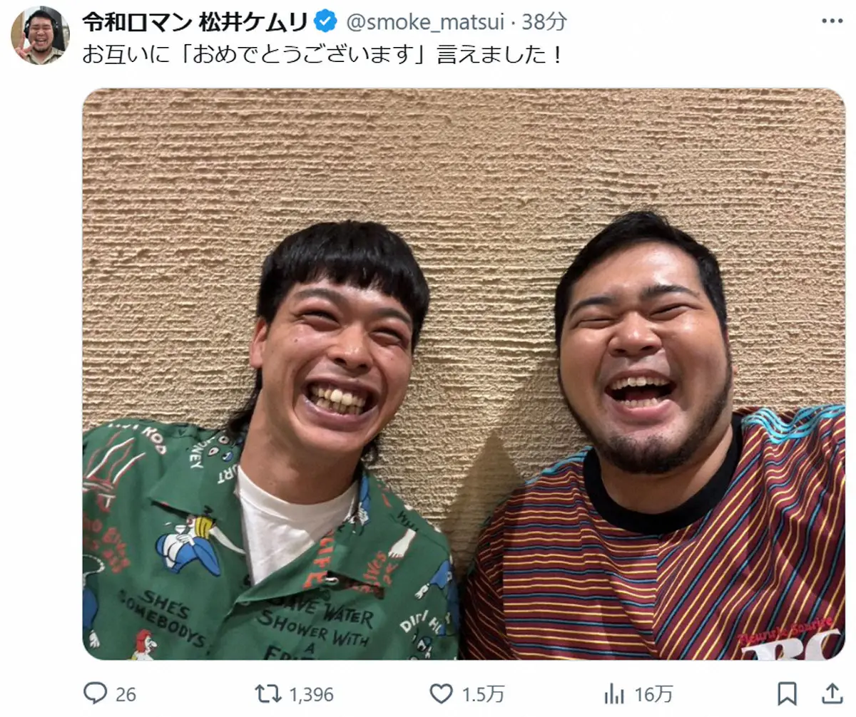 お笑いコンビ「令和ロマン」の松井ケムリ(32)が18日、自身のX(旧ツイッター)を更新。お笑いコンビ「バッテリィズ」のエース(30)と幸せツーショットを公開した。