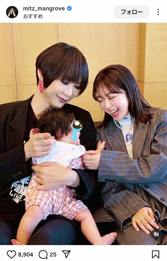 写真には、ミッツが抱える我が子を微笑ましく見守る峯岸の姿が。3人で仲睦まじく写真に収まった。