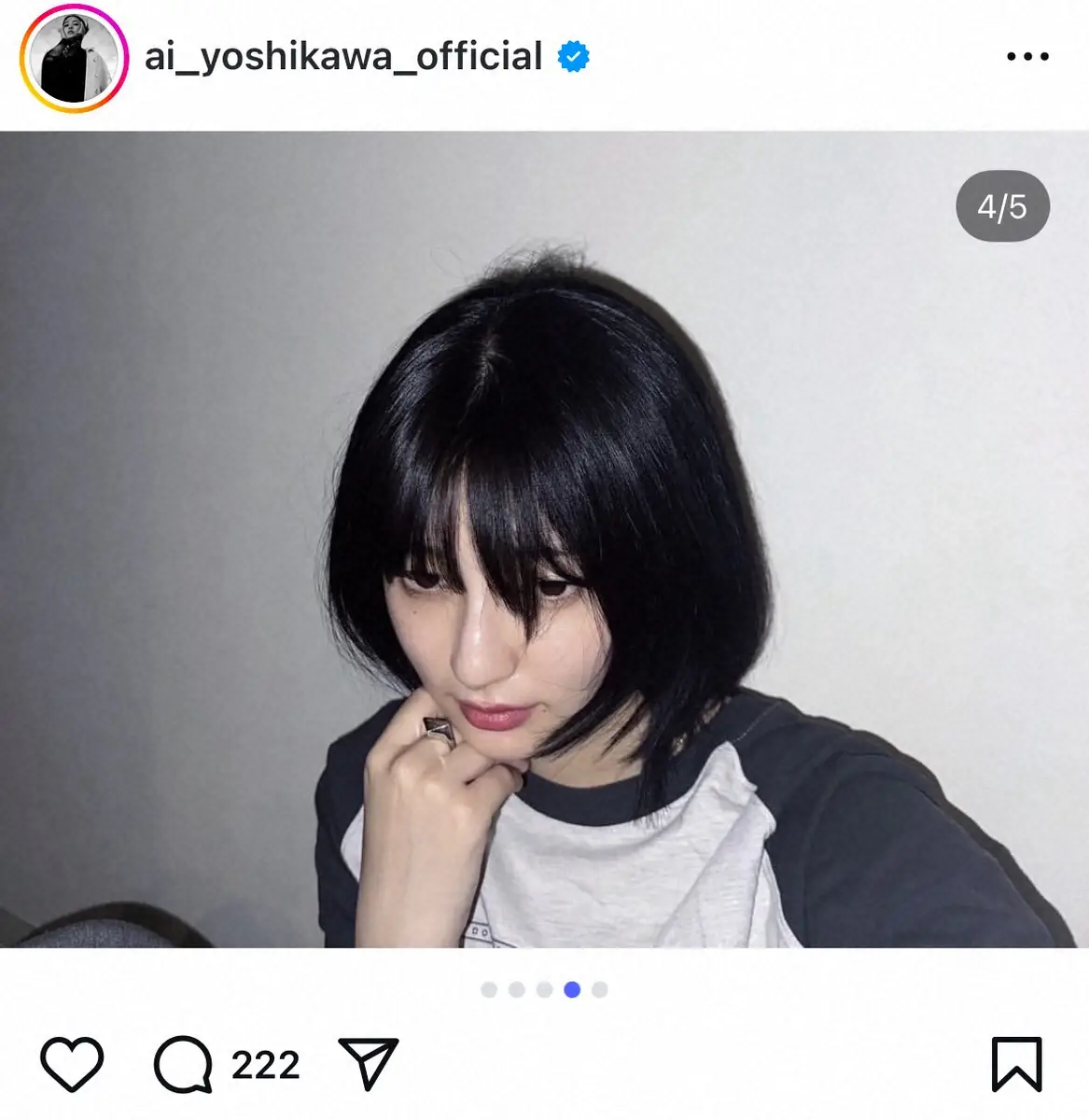 この日、吉川は「エクステ外してレイヤーいっぱい」とコメントを添え、これまで胸下まであった茶髪のロングヘアから一転、暗めカラーのボブスタイルに大胆イメージチェンジを遂げた姿を披露。