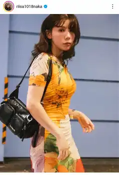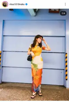 仲はオレンジ、黄色、白色の鮮やかな花がプリントされたタイトドレス姿を披露し、「太陽みたいな着るだけで気持ちが高まるDesigualのアートドレス」と紹介。