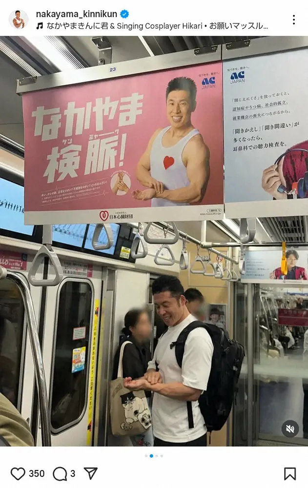きんに君は「なかやま検脈んです」と書き出し、「はい」「サイドチェスト」「キャー検脈しながサイドチェストするのステキー」と投稿。白いTシャツにリュックを背負った移動スタイルで、自身がイメージキャラクターを務める電車の中吊り広告との2ショット写真を公開した。