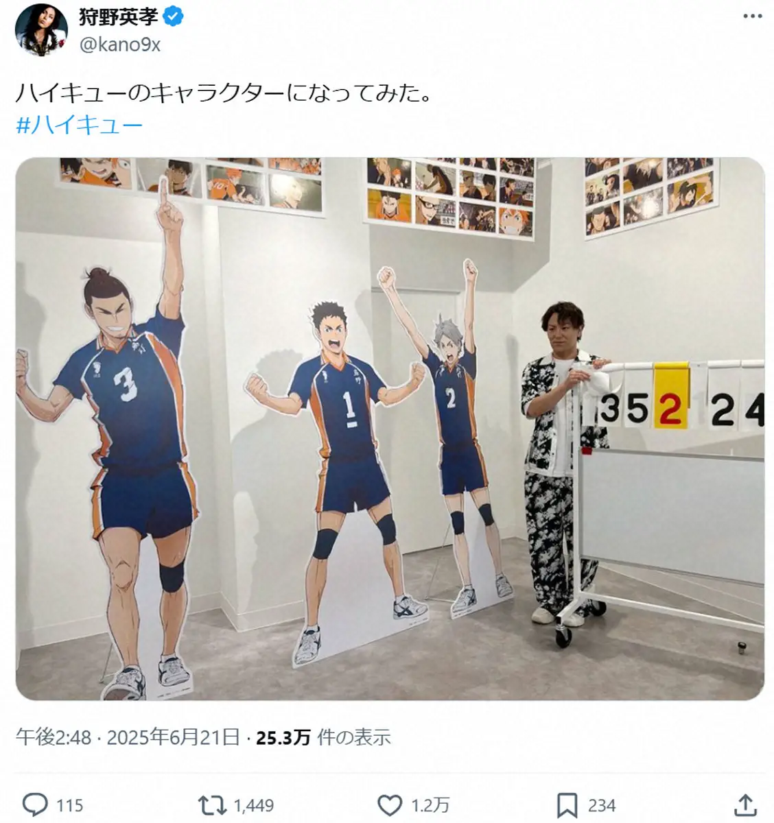 お笑いタレントの狩野英孝(43)が21日、自身のX(旧ツイッター)を更新。最近ハマった人気漫画「ハイキュー!!」の“推し活”写真を投稿し、注目を集めている。