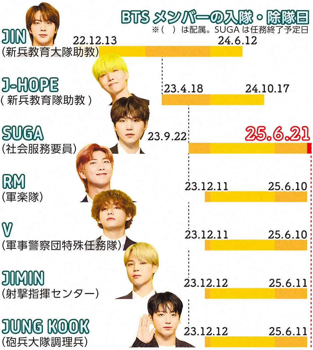 韓国の人気男性グループ「BTS」のメンバーで、兵役の部隊配属の代わりに公的機関での勤務を1年9カ月行っていたSUGAが21日、任務解除日を迎えた。今月10~11日にはリーダーのRMらが陸軍を除隊し、全員の兵役が終了した。