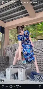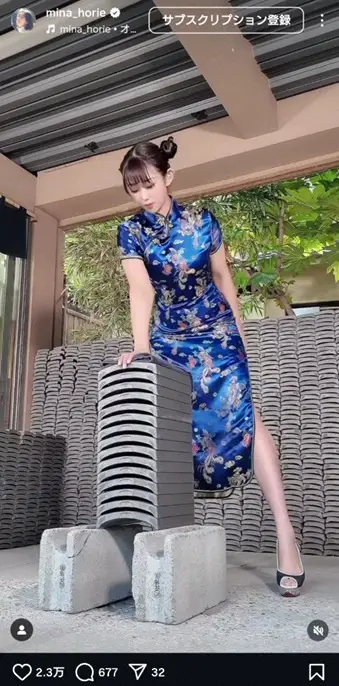 「初めての“片手”寸勁にチャレンジ 結果は… 武術家の東吾先生 @togo.ishii にワンインチパンチを教えてもらいました!フルver,はYouTubeを見てみてね!コメントにとても愛が溢れていて感謝です」とつづり、ブルーのチャイナ服で、右手での寸勁で瓦15割りにチャレンジするショットをアップした。