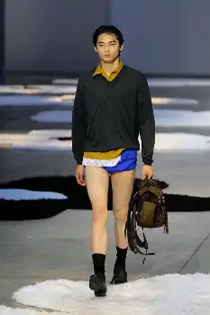 22日に開催されたプラダのショーでは、キャメル色のシャツにグレーのニット、鮮やかなブルーの超ショート丈のパンツ姿で登場し、ランウェーを歩いた。