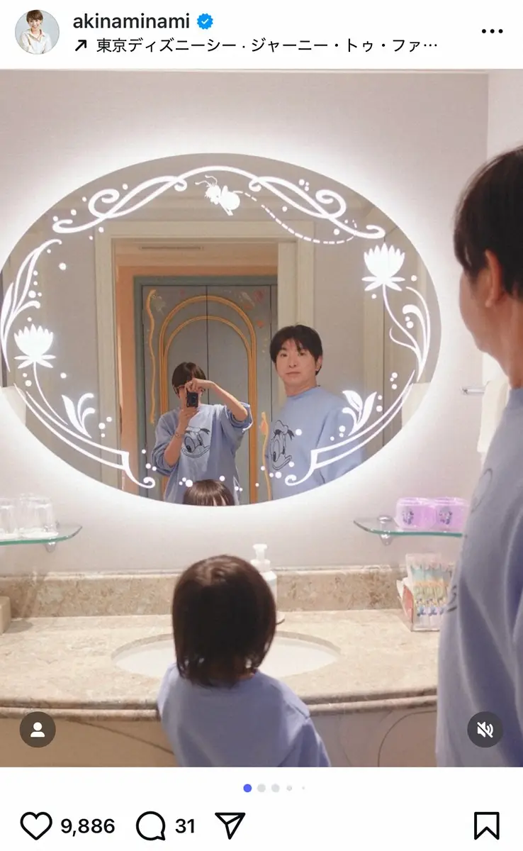 「先日ついに ファンタジースプリングスホテル、ファンタジーシャトーの予約が取れて宿泊してきました」と書き出した南。おそろいのTシャツを着た夫・濱口優と長男との鏡越し3ショットを公開した。