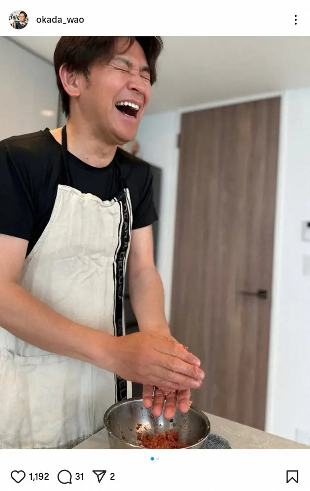 岡田は「子供の1歳の誕生日にハンバーグを作る岡田」と題し、エプロンを着けて爆笑しながらハンバーグを作る様子を公開。ハッシュタグで「岡田の料理」「野菜も豆腐もお肉も入った栄養満点ハンバーグ」「おめでとう」と添えた