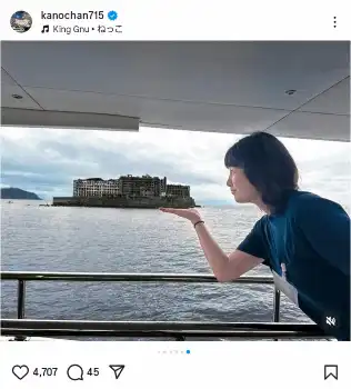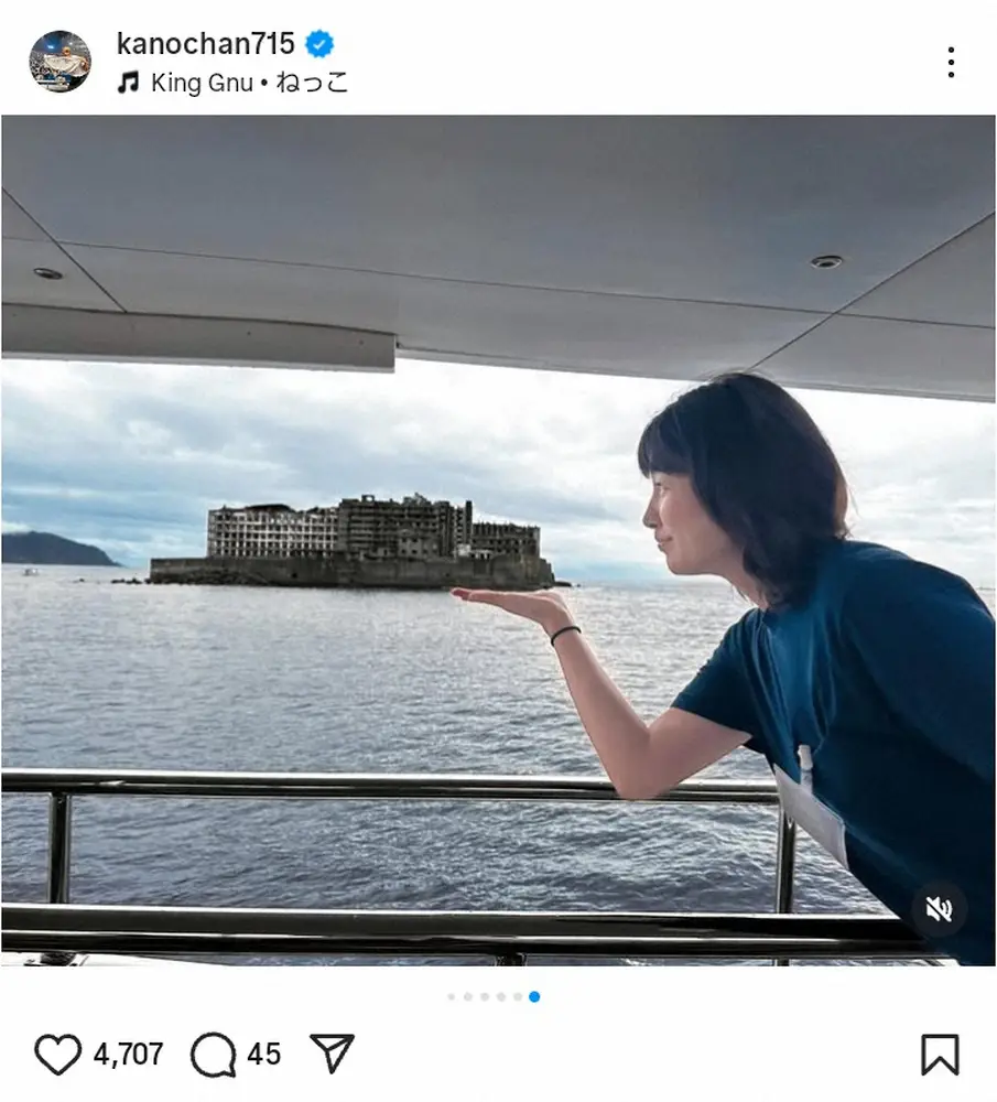 狩野さんは「人生の中で行ってみたい場所TOP3(国内編)に鎮座していた『端島』通称『軍艦島』に行ってきました」と報告。昨年放送されたTBS系日曜劇場「海に眠るダイヤモンド」の舞台となった、軍艦島での写真や船からの景色を披露した。