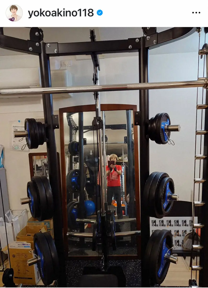 「家のジムです」とつづり、トレーニング器具の写真を投稿。鏡には赤のTシャツ姿の秋野の姿も映り込んでいる。