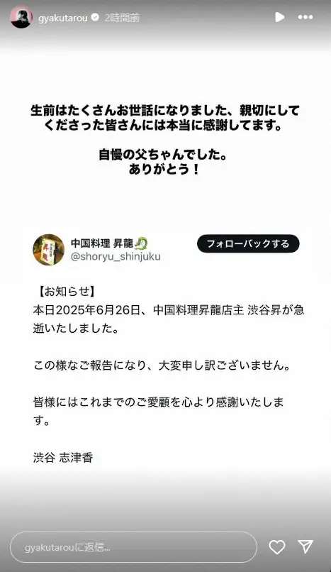「SUPER BEAVER」渋谷龍太 Photo by スポニチ SUPER BEAVER渋谷 中華料理店主の父死去を報告「自慢の父ちゃんでした。… ギャラリーで見る この記事のフォト 2025年06月27日の画像一覧 もっと見る 2025年06月27日の画像をもっと見る