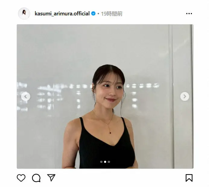 有村は黒いハートの絵文字を3つ使用し、オフショットをアップ。デコルテがあわらになったブラックドレス姿で微笑む写真などを投稿した。
