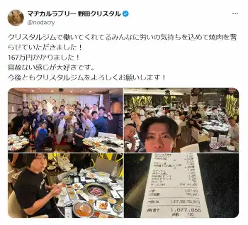 野田クリスタル 焼き肉を超大盤振る舞い!お値段にファン衝撃「太っ腹すぎる」「漢気あってステキ」