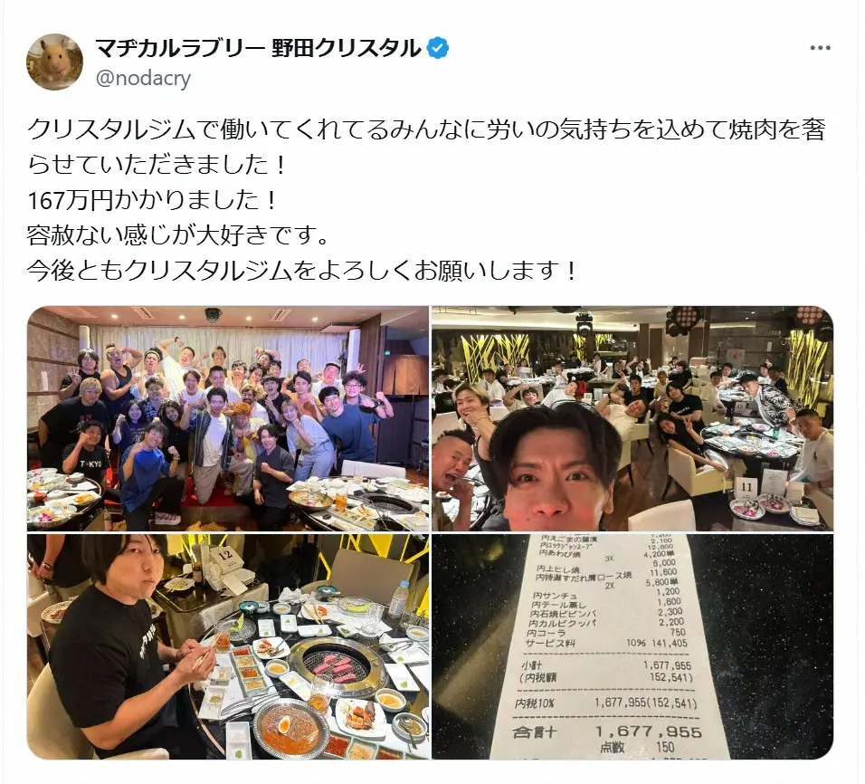 この投稿に、フォロワーからは「野田クリ最高だわ」「凄すぎます」「太っ腹すぎる」「ジム長ほんとカッコいい」「すごい大宴会」「漢気あってステキ」などの声が寄せられている。