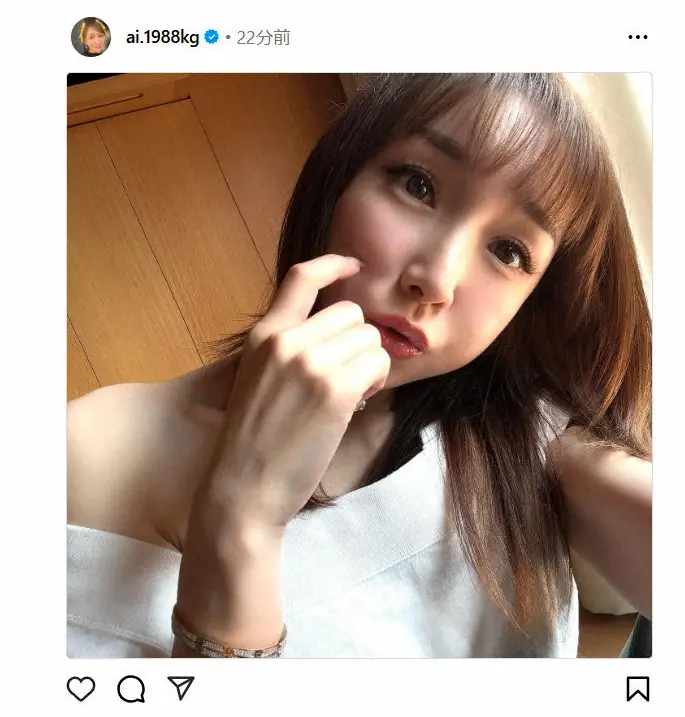加護は「暑いね」とつづり、肩があらわになったオフショルダーの白いトップス姿の最新ショットを投稿した。