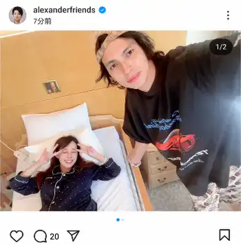アレクサンダーは「いよいよです のんちゃん入院しました」とつづり、ベッドに横たわってダブルピースする川崎との2ショット写真を投稿。