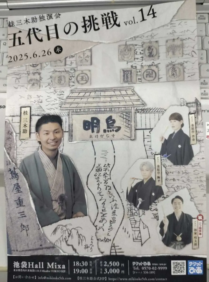 【佐藤雅昭の芸能楽書き帳】空梅雨気味の6月。「まとまった雨が欲しいなあ」と時に空を見上げてみるが、そんなもやもやも吹き飛ばしてくれる楽しい会だった。6月26日、東京・池袋のHall Mixaで開かれた桂三木助独演会「五代目の挑戦vol.14」だ。