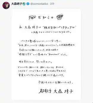 また大森自身もXで直筆の報告文を掲載。「私、大森靖子は"株式会社パンクチュアルに所属させていただくことになりました」と発表。「パンクの聖域なんてかっこいいと思い、“社名、超かっこいいです!所属させてください!”と代表取締役の守時さんにお願いしたところ、社名の由来は“時間を守る”という意味での“Punctual”でした」とつづった。