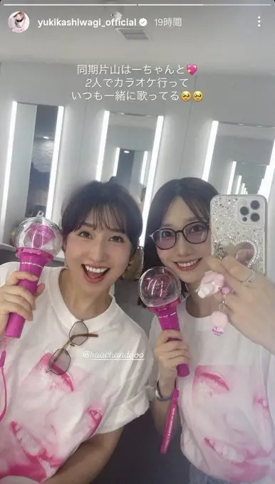 2枚目で一緒に写っていたのは元AKB48の片山陽加。「同期片山はーちゃんと 2人でカラオケ行っていつも一緒に歌ってる」とつづった。