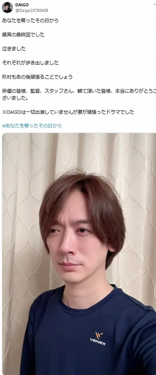 その上で「※DAIGOは一切出演していませんが妻が頑張ったドラマでした」と添えた。