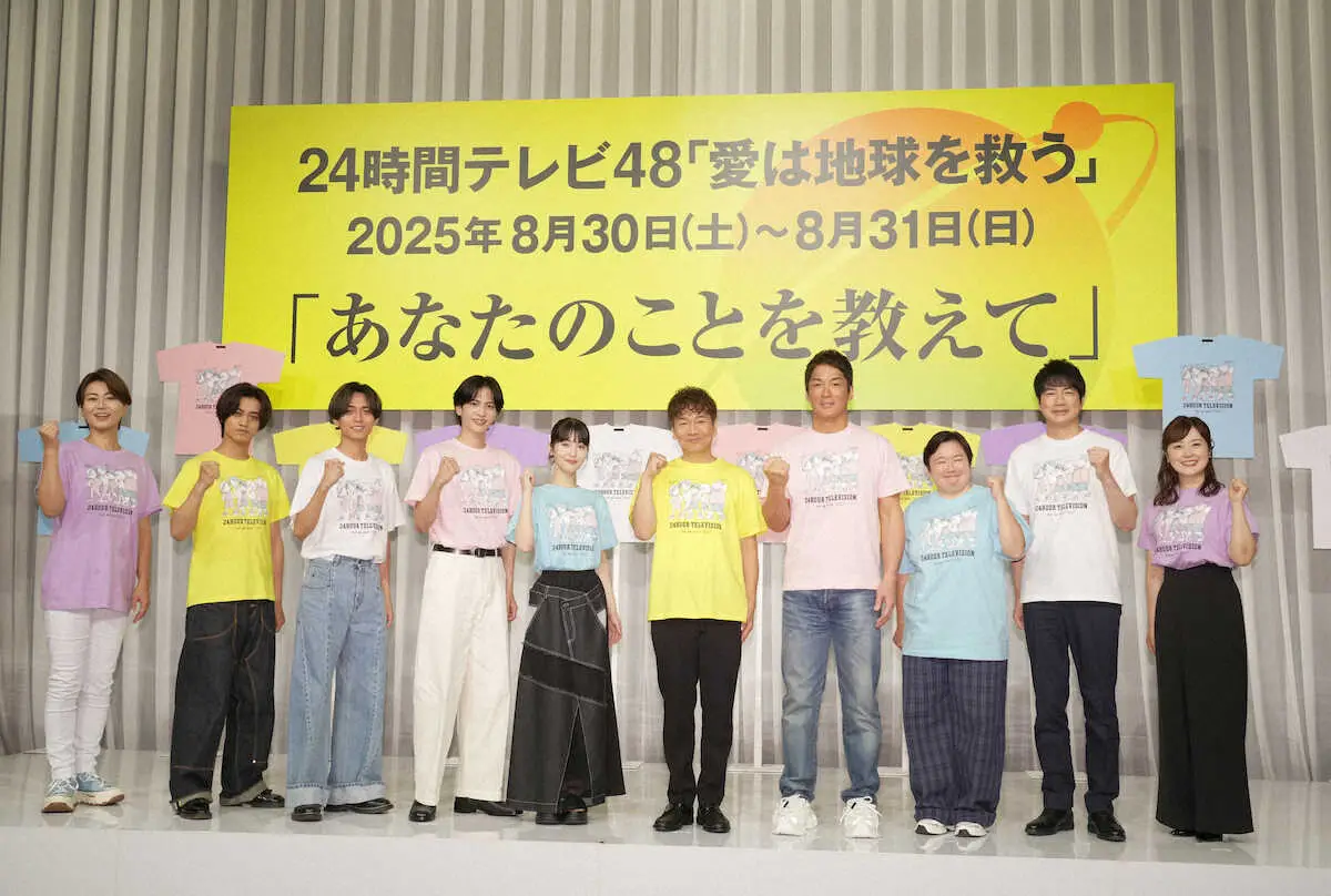 来月の30、31日に東京・両国国技館で開催し放送される日本テレビ「24時間テレビ」の制作発表会見が1日、東京・汐留の同局で行われた。総合司会のお笑いコンビ「くりぃむしちゅー」の上田晋也や、今年新設されたチャリティーパートナーにこの日に就任したKing&Princeら計10人の出演者が登壇した。