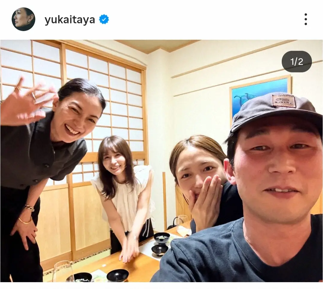 「会うと元気をもらうかわいい年下の友人たちと 芝居見て、話すると、刺激になるおばさんの気持ちがわかるおじさん もしくは、おばさん」と関係性を明かし、「でも、彼に会うと母ちゃん気分になる、あたし」とつづった。