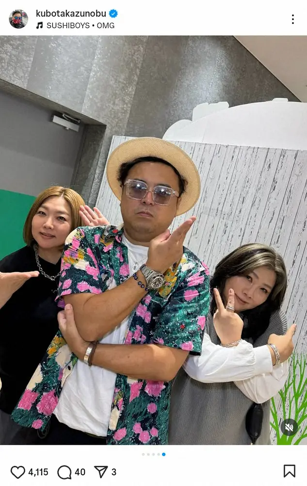 久保田は「夏とブルーノマーズは毎年やってくる」とコメント。帽子にサングラスを合わせたファッションでポーズを取った写真や、お笑いコンビ「海原やすよ ともこ」の2人との3ショットを公開した。