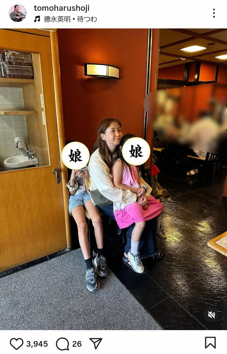「蕎麦屋で待つ俺の女たち」とつづり、待合場所と思われる椅子に、次女を抱えた藤本が座り、同じ椅子に長女が座る光景を収めたショットを公開。
