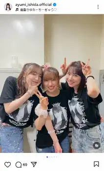 石田は、うさぎとピンク、緑、青のハートの絵文字を書き出し、「3人楽屋一緒だったけど、基本まさきはずっといなくて、譜久村さんは横にいてお話したり動画見てたり、あと睡魔と戦ってたり、やっぱりってことが多くて、いい日でした」とつづり、同じく元モーニング娘。で10期メンバーの佐藤優樹と9期メンバーの譜久村聖との集合写真を投稿した。