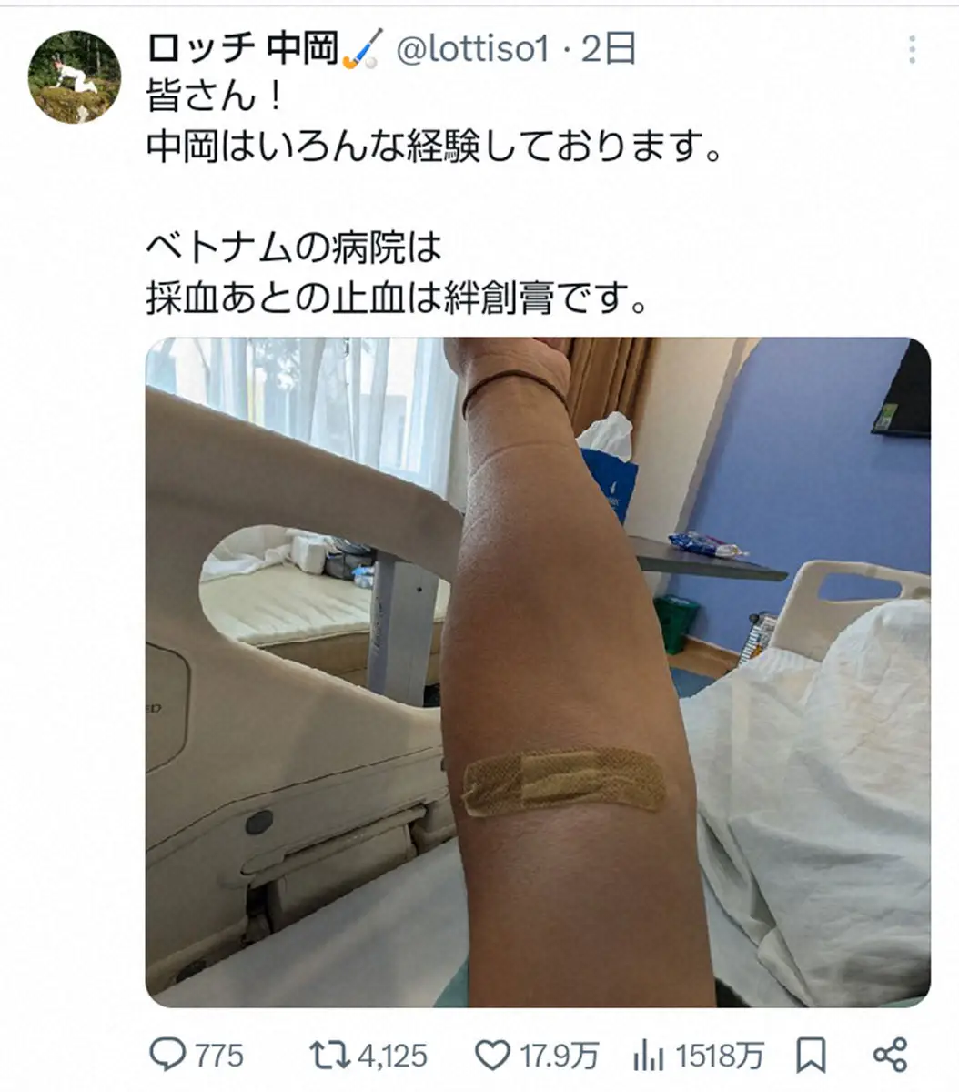 「ロッチ」中岡創一のX(@lottiso1)から ベトナムでロケ中にケガのロッチ中岡 帰国を報告 病院のお馴染み“グッズ… ギャラリーで見る この記事のフォト 2025年07月09日の画像一覧 もっと見る 2025年07月09日の画像をもっと見る
