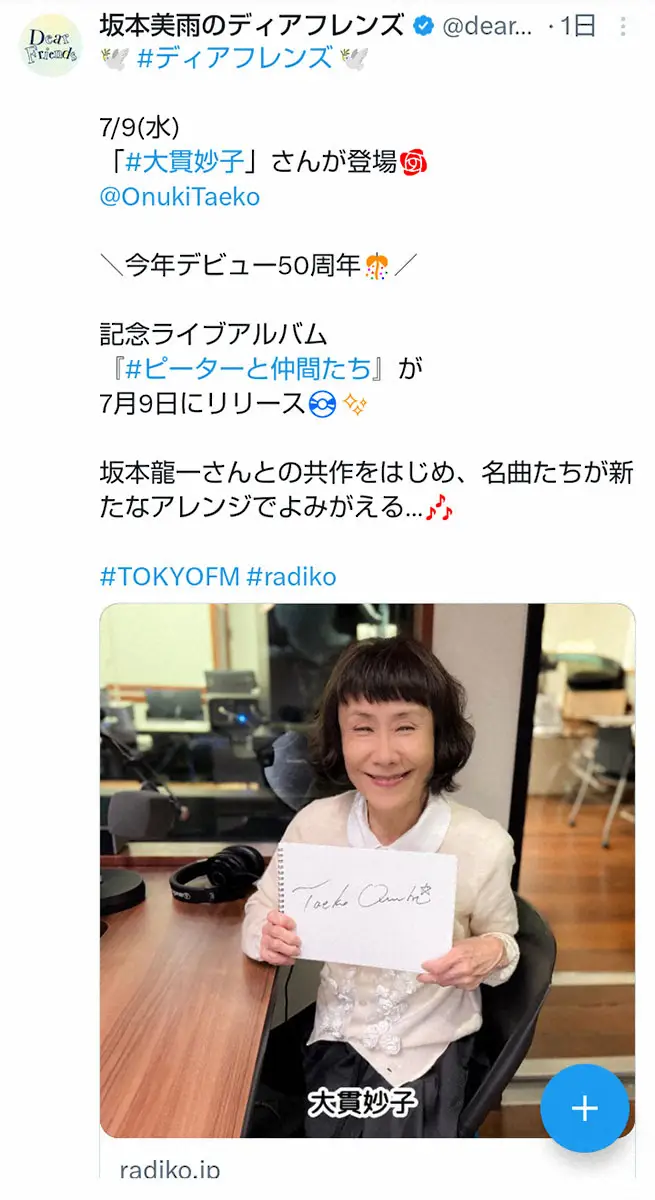 龍一さんとは、20代の頃から兄妹のような付き合いを続けていたという大貫。番組で、この日発売の24年7月公演のライブアルバム「ピーターと仲間たち」から龍一さんがアレンジを手がけた楽曲「宇宙みつけた」をかけた後、娘の美雨は「かっこいい!お父さんっていう感じ」「本当にでも、音色一つで坂本龍一だって思います」と感想をつぶやいた。
