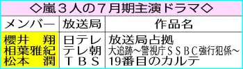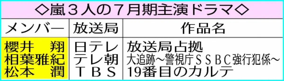 フォトセッションに臨む(左から)清水尋也、生瀬勝久、新田真剣佑、松本潤、小芝風花、木村佳乃、ファーストサマーウイカ、岡崎体育(撮影・河野 光希) Photo by スポニチ 松本潤 TBS日曜劇場「19番目のカルテ」舞台あいさつで“嵐祭り”アピール … ギャラリーで見る この記事のフォト 2025年07月10日の画像一覧 もっと見る 2025年07月10日の画像をもっと見る