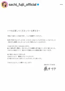 「いつも応援してくださっている皆さまにご報告です」と記し、直筆署名入りの文書と投稿。「日頃より温かいご支援を賜り 心より感謝申し上げます。私事で恐縮ではございますが、このたび、かねてよりお付き合いしておりました一般の方と結婚いたしましたことをご報告させていただきます」と一般男性との結婚を報告した。