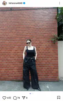胸元が大きく開いたタンクトップ、ワイドパンツ、小物も黒でまとめ、細めのフレームのサングラスを合わせた。