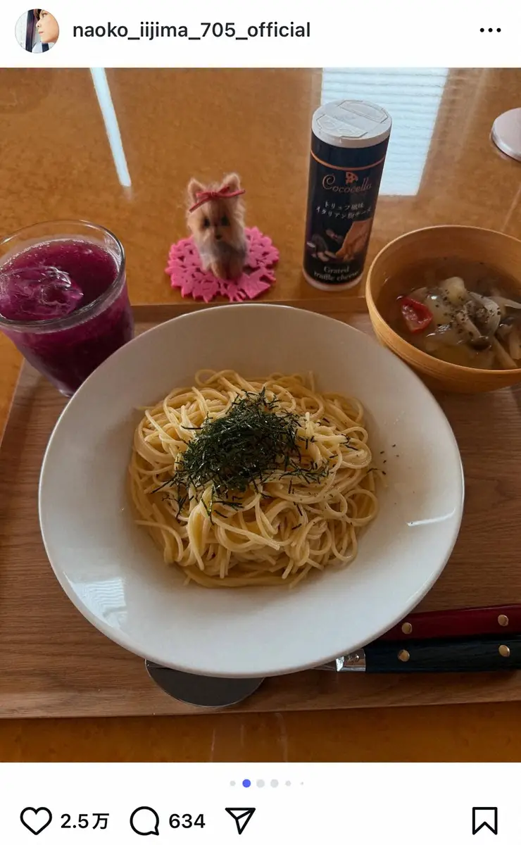 「今朝は、レトルトスパゲッティを食べました 便利なモノがたくさんありますね 本当に感謝感激」とつづった飯島。パスタをメインに、手作りのスープ、自家製の紫蘇ジュースが並んだ食卓の写真を披露した。