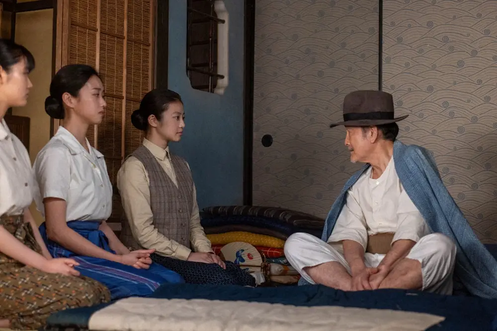 連続テレビ小説「あんぱん」第79話。朝田釜次(吉田鋼太郎)は愛息・朝田結太郎のソフト帽をかぶり、3姉妹に「面白がって生きえ」――(C)NHK