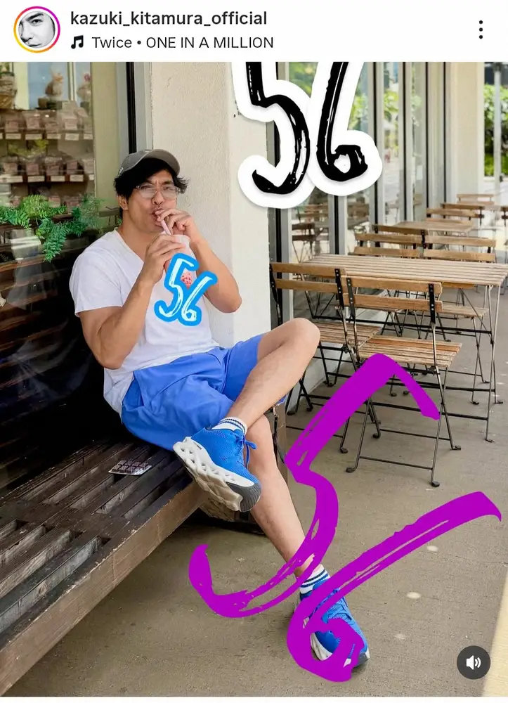 白シャツとブルーのショートパンツにキャップとサングラスを合わせた夏らしい装いのショットに、「56」の手書きスタンプを添えた写真を公開した。