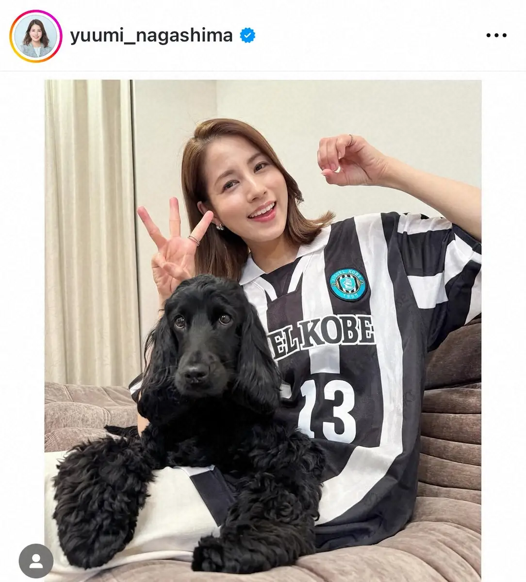 この日「襟付き白黒ストライプが23年ぶりに復活!ということで…引っ張り出してみました」とつづると、ヴィッセル神戸のユニホーム姿で愛犬と写るショットを公開。