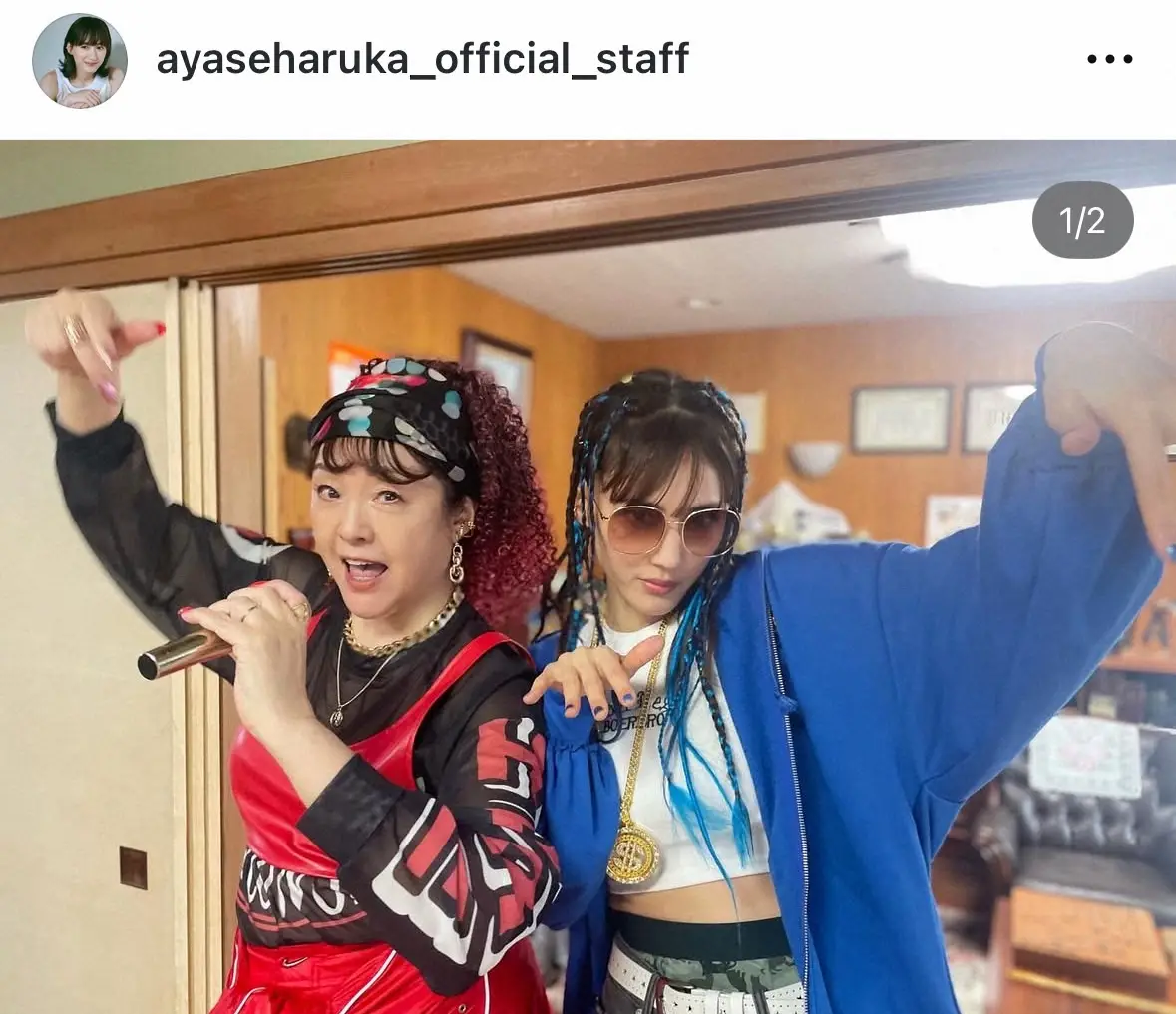 1枚目の写真では、共演する松坂慶子とともにラッパー風の衣装に身を包み、ブルーの編み込みヘアとサングラス姿でノリノリのポーズを披露。2枚目には、高い位置で編み込まれた綾瀬の髪型が印象的な後ろ姿が写っていた。