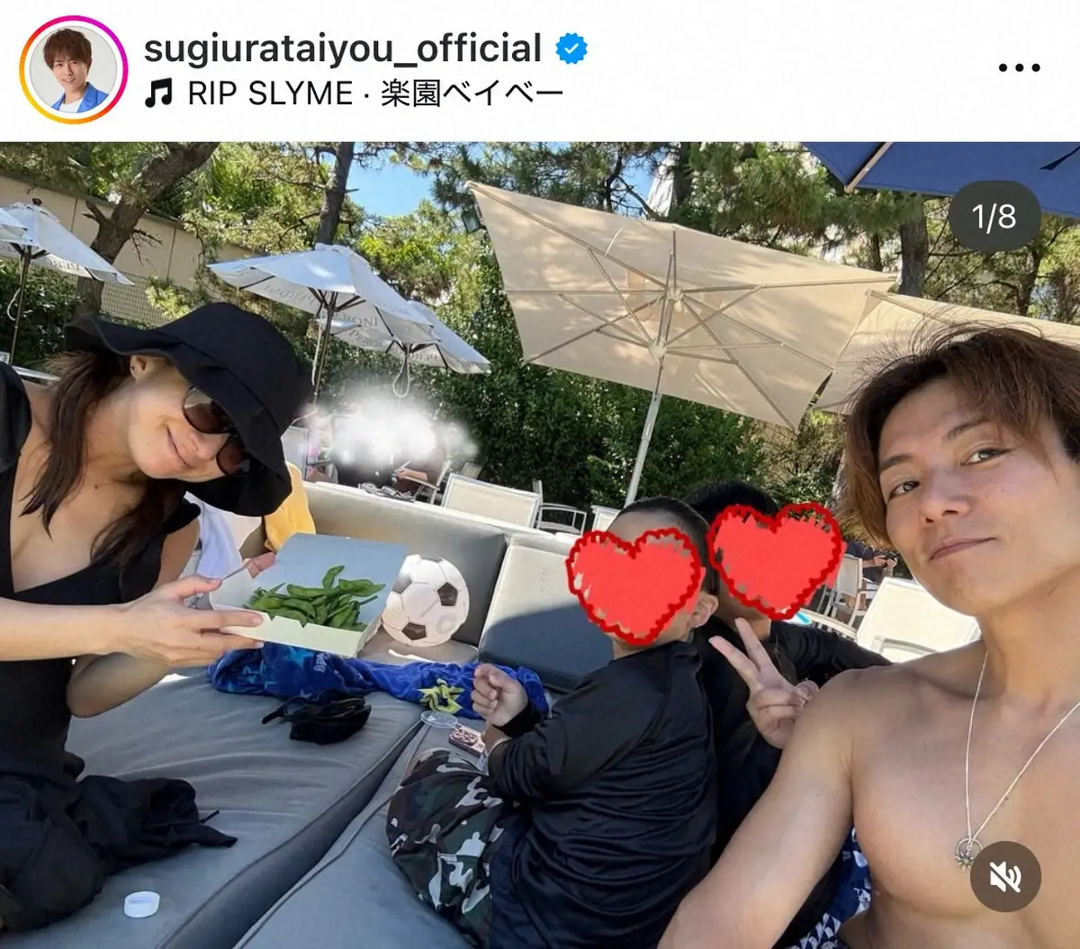 「プール遊びを満喫しました 南国気分」とし、ビーチボールを手にピースサインを決める姿や、プールサイドで三男・幸空(こあ)くんとかき氷を頬張るほほ笑ましい様子も見せ、充実した時間を過ごしたことをうかがわせた。