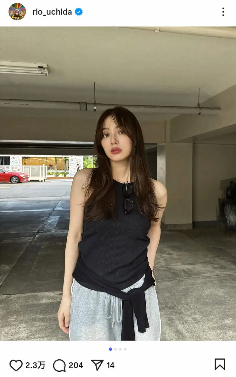 また、黒のタンクトップにグレーのスウェットを合わせたカジュアルコーデも披露。ストーリーズで「タンクとカーディガンはUNIQLOで、スウェットはmaison Specialだよ」と解説した。