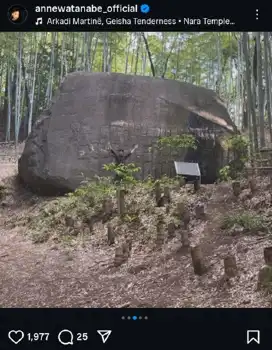 「わたしは、奈良派 いざいざ益田岩船」とつづり、奈良県橿原市の巨大な石造物「益田岩船」でのショットをアップ。