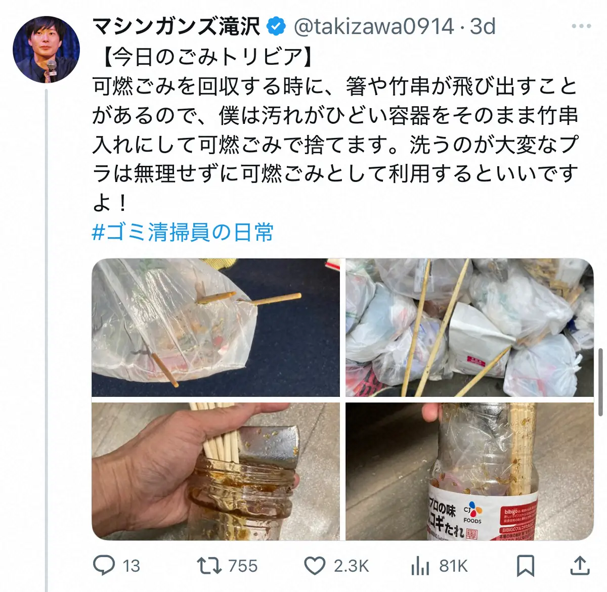 滝沢は「【今日のごみトリビア】」とし「可燃ごみを回収する時に、箸や竹串が飛び出すことがあるので、僕は汚れがひどい容器をそのまま竹串入れにして可燃ごみで捨てます」と紹介。