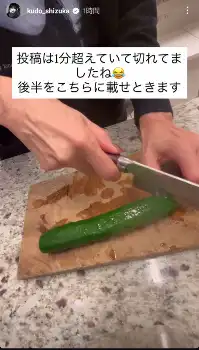 工藤は「以前ご紹介した伸びるきゅうり!切り方を紹介して欲しいと言う声が多かったので」とつづり、きゅうり1本を蛇腹切りする様子を動画で投稿した。「こっちをまっすぐに入れて、もう片面を斜めに。これ、かなり深く入れないと…見えるかな」と言いながらリズミカルに包丁を入れる手さばきを披露したもの。
