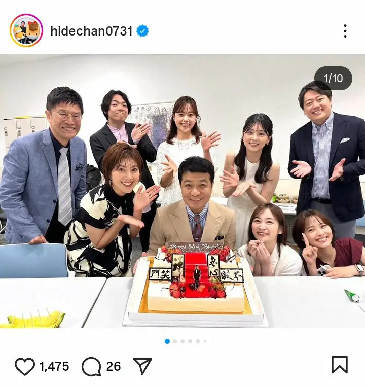 タレントの中山秀征(57)が27日、自身のインスタグラムを更新。今月31日の58歳誕生日を共演者から祝われたことを明かし、集合ショットを披露した。