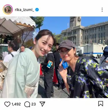 6月にサッカー日本代表と結婚発表の泉里香 祇園祭での人気女優との2ショット披露に「美女2人」の声