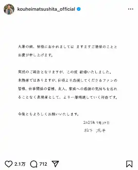 松下洸平、結婚を発表 お相手は一般女性 ファンサイトでは全文直筆文で報告