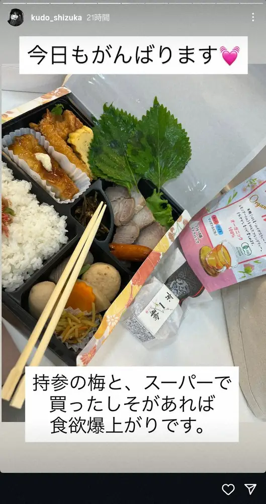 また地元銘菓なども堪能したようで「会場に着くまでに工藤スーパーハイオク満タンです」とコメント。続く投稿で「今日もがんばります」と大葉が添えられた弁当の写真を披露し、「持参の梅と、スーパーで買ったしそがあれば 食欲爆上がりです」と伝えた。