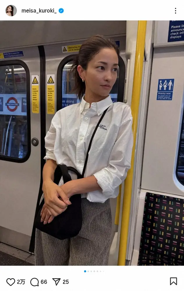 この日はイギリス国旗の絵文字を添え、「よく考えたら20年ぶりだった」と“訂正”。ひっつめ髪に白いシャツ、茶系のパンツを合わせたスタイルで、地下鉄に乗る姿を披露した。